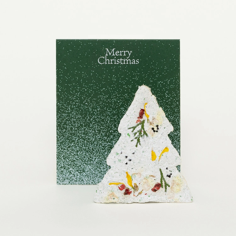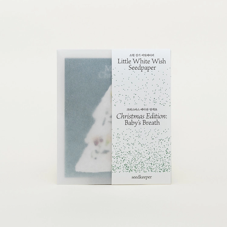소원 심기 씨앗페이퍼는 안개초 씨앗이 수놓아진 모두 다른 트리 모양의 씨앗페이퍼, 테이블 위에 세워둘 수 있는 크리스마스 카드, 사용방법이 자세히 안내된 매뉴얼, 안쪽이 환히 들여다 보이는 컨셉트레싱지 봉투로 구성됩니다. 구성품 및 크기 씨앗페이퍼 80x90mm 크리스마스 카드 100x120mm 매뉴얼 98x118mm 봉투 115x135mm |